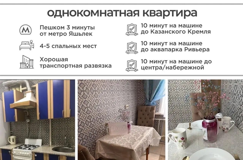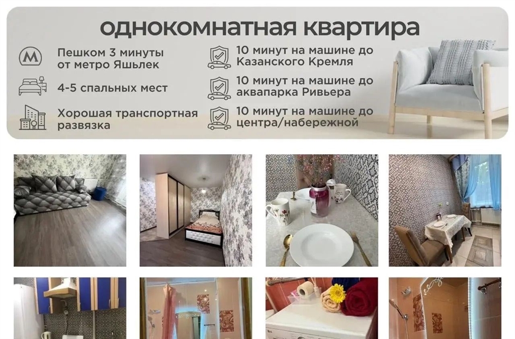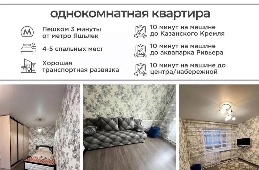 идеальная однокомнатная квартира у метро яшьлек для жизни и путешествий свободна с 8 февраля.сдаётся светлая и полностью оборудованная однокомнатная квартира в отличном расположенииглавное преимущество локация в 2 минутах ходьбы от станции метро яшьлек. отличная транспортная доступность квартира находится между двумя жд вокзалами. до главных достопримечательностей казанского кремля, набережной, пешеходной улицы баумана и цирка всего 2 станции на метро. вся инфраструктура под рукой прямо рядом 1 минута пешком московский рынок с разнообразными кафе и магазинами. зимой каток и праздничная площадка с новогодними украшениями. легко добраться в любую точку города идеальная транспортная развязка. экономьте время и деньги до работы или центра можно доехать на одном маршруте автобус, метро или трамвай. для отдыха до аквапарка ривьера всего 15 минут на машине.квартира полностью готова к комфортному проживанию вся необходимая техника стиральная машина lg, кондиционер, микроволновая печь, smart tv. есть уютный балкон. все фотографии реальные, вы видите именно то, что снимаете.отличный вариант для длительной аренды на период учебы, работы или путешествий по татарстану.детали адрес ул. энергетиков, 3. свободна с 8 февраля 2026 года. предпочтительный период аренды до конца мая 2026 года. собственник сдаёт квартиру порядочным, ответственным жильцам.просьба к риелторам рассматриваем ваши предложения только вместе с готовым клиентом.готовы показать квартиру в удобное время свяжитесь, чтобы обсудить детали и назначить просмотр.