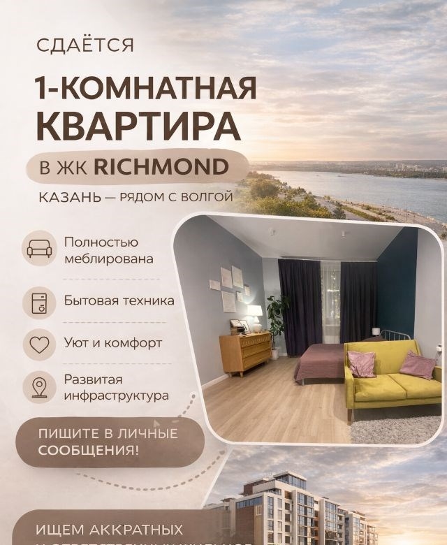 светлая и очень уютная 1к квартира в которой приятно житьподойдёт для одного человека или пары, кто ищет не просто жильё, а комфортное пространство для жизни.интерьер с характером спокойные оттенки, акцентные детали, тёплый свет. дом современный, приятная территория кировский район, жк richmond квартира полностью готова к заселению можно заехать и житьквартира сдаётся на следующих условиях аренда 38 000 руб ку гибкие условия по залогу без залога при условии планового осмотра квартиры раз в 3 месяца, либо залог 40 000 руб без осмотров минимальный срок аренды 6 месяцев оплата ежемесячно до 5го числа.важно квартира подойдёт аккуратным и ответственным жильцам без маленьких детей и домашних животных некурящие или строго без курения в квартире без шумных мероприятий и вечеринок при досрочном выезде уведомление за 30 дней и квартира возвращается в чистом видедополнительно обязательное бережное отношение к мебели и технике мелкие бытовые расходы лампочки, мелкий ремонт за счёт арендатора в случае порчи имущества компенсация запрещена субаренда без перепланировок и изменений интерьера без согласования осмотр квартиры проводится по предварительной договорённости, чтобы всё было прозрачно и спокойно для обеих сторон. на звонки не отвечаю, пишите